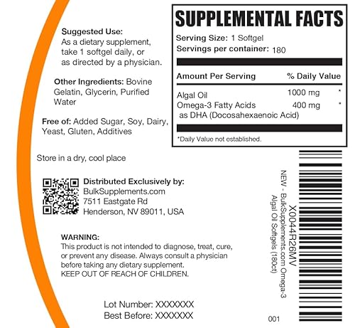BulkSupplements.com Omega-3 Softgels – from Algal Oil, Algae Oil Omega 3 Supplement – Gluten Free, 1 Softgel per Serving, 180 Count (Pack of 1)