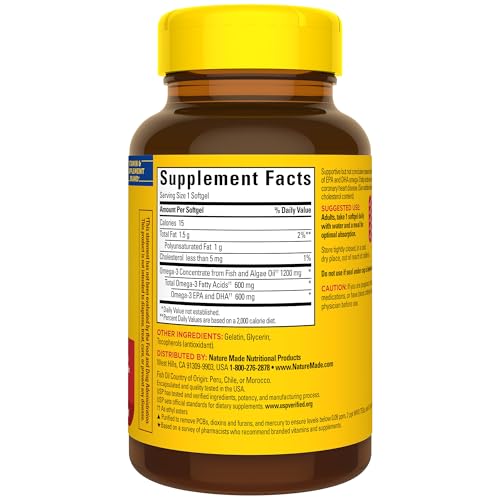 Heart, eye and brain support supplement: contains one 60 count bottle of Nature Made Omega 3 (1) from Algae & Fish Oil 1200 mg (600 mg Omega-3) for a 60-day supply