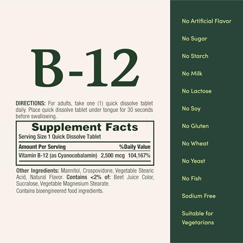 QUALITY IS OUR PRIORITY: Nature’s Bounty is dedicated to the security of all of our dietary supplements. Our fast dissolve Vitamin B-12 tablets are gluten free, sugar free, comprise no synthetic flavors or sweeteners, and are appropriate for vegetarians